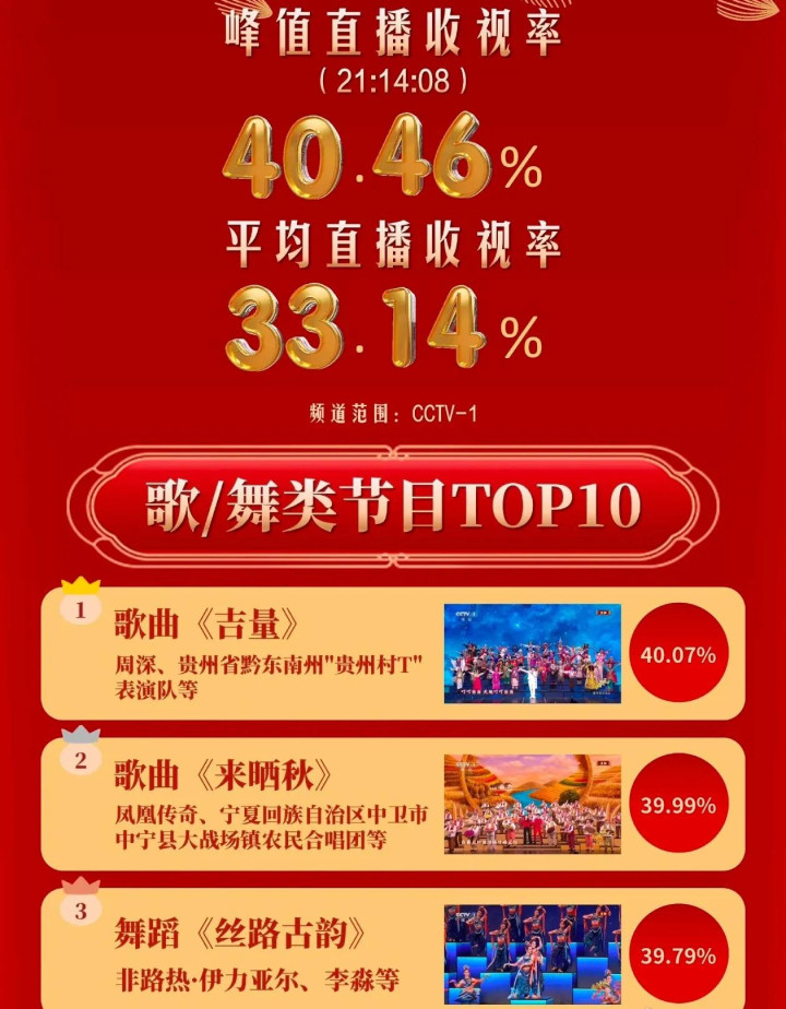 从收视率来看,本年央视春晚初次冲破了40%,再创历史新高,看得出来,各人关于央视春晚的怜爱之情,据关总计据线路,马年春晚,盛名歌手周深拿到了收视率峰值,以40.07%的得益成为当晚收视率最高的节目。