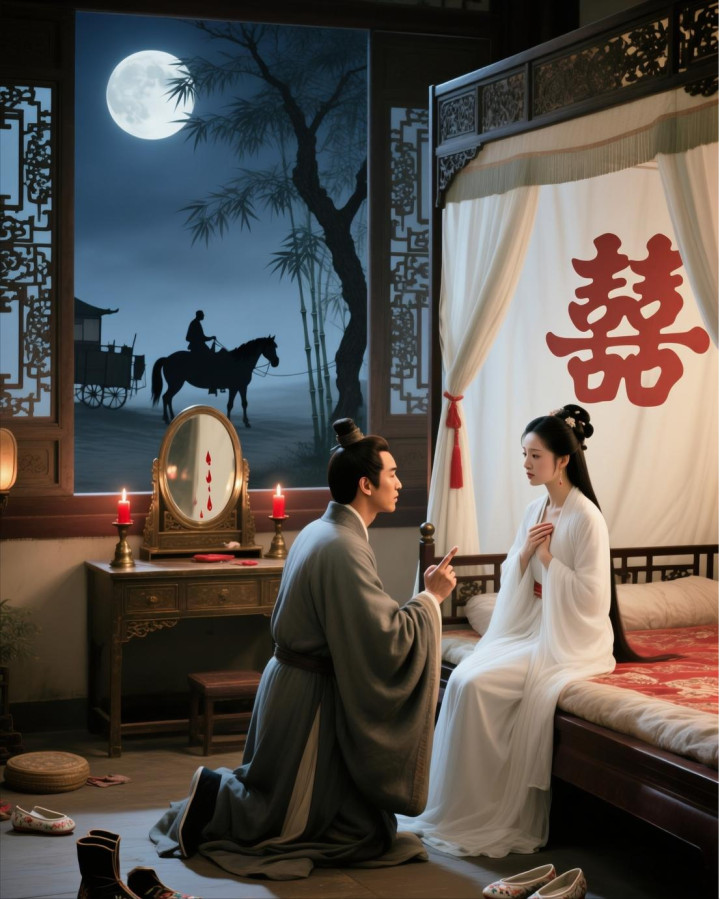 当夜,沈翊骑马,带着那面铜镜,连夜赶往南阳府。孟婉娘的魂魄附在铜镜之中,一齐上与他断断续续地说着旧事。三百多里的路程,沈翊骑了一天整夜,终于在第二日薄暮赶到了南阳府城。
