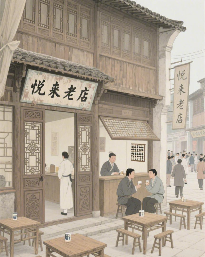 悦来老店坐落在汲县城东最鼎沸的街上,是一栋两层的木楼,门口挂着一块褪了色的牌号。沈翊排闼进去,只见堂屋里摆着七八张桌子,惟有两个宾客坐在边缘里喝酒,匿影藏形,全无往日吵杂时势。