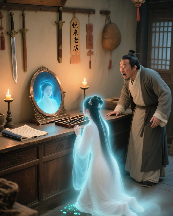 沈翊从怀中取出那面铜镜,放在柜台上。孟婉娘的魂魄从镜中缓缓现出,白衣飘飘,泪流满面,跪在男东说念主眼前,喊了一声:“舅舅……”