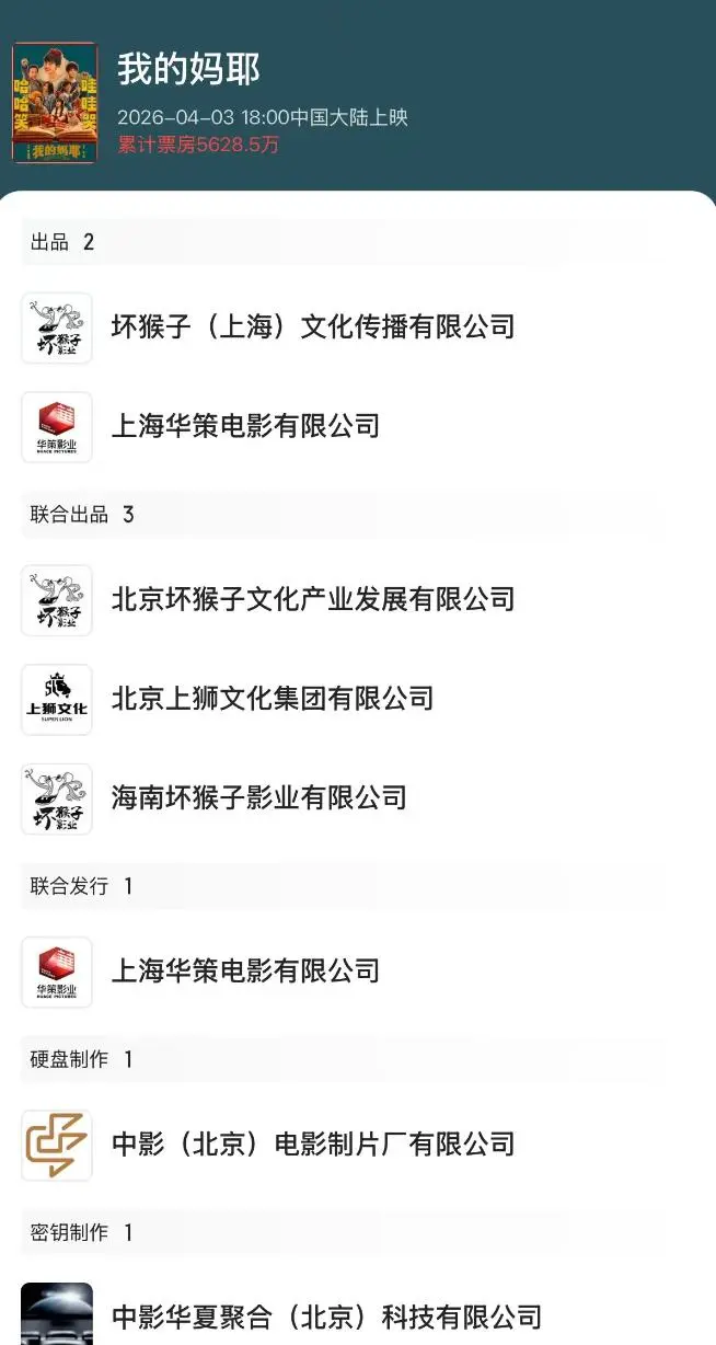 该片的威望如故很强大的,天然了,最大的联系户还要数宁浩了,他既是该片的监制,亦然这一部电影的投资东说念主,稽查背后的成本,宁浩的坏山公影业排在《我的妈耶》出品方的第一位,算是第一投资者了。但按照这个威望来说,票房5000多万,片方分账不到2000万,如故很难遮掩住成本的,宁浩新片扑街。
