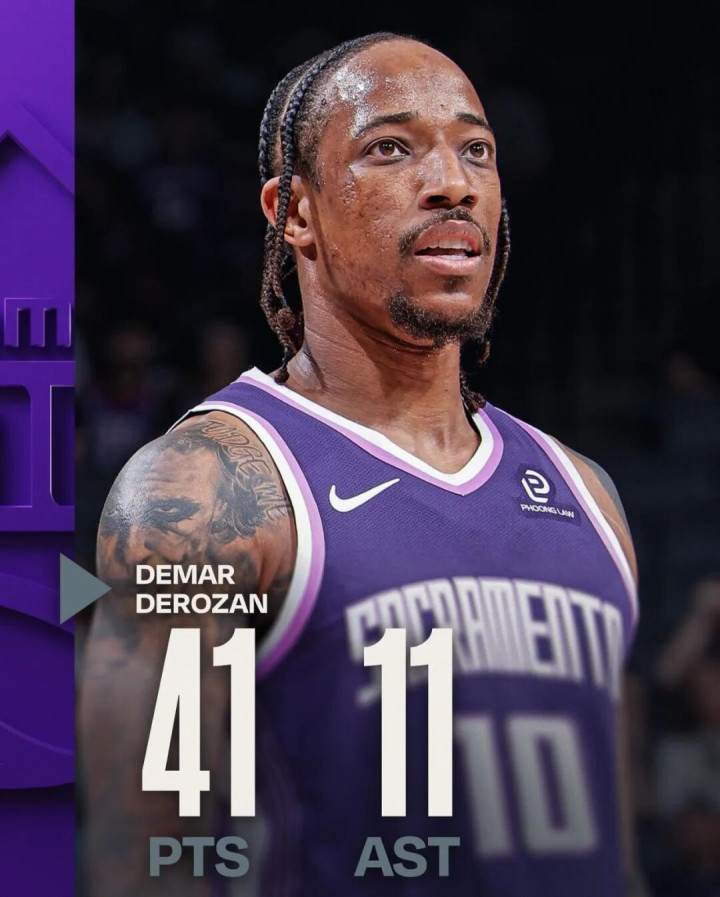 这场西部倒数之争,国王球星德罗赞打出了可能是本赛季个东说念主最佳的一场比赛:全场出战38分钟,投篮21中11,三分3中1,罚球21中18,拿下41分4篮板11助攻3抢断。