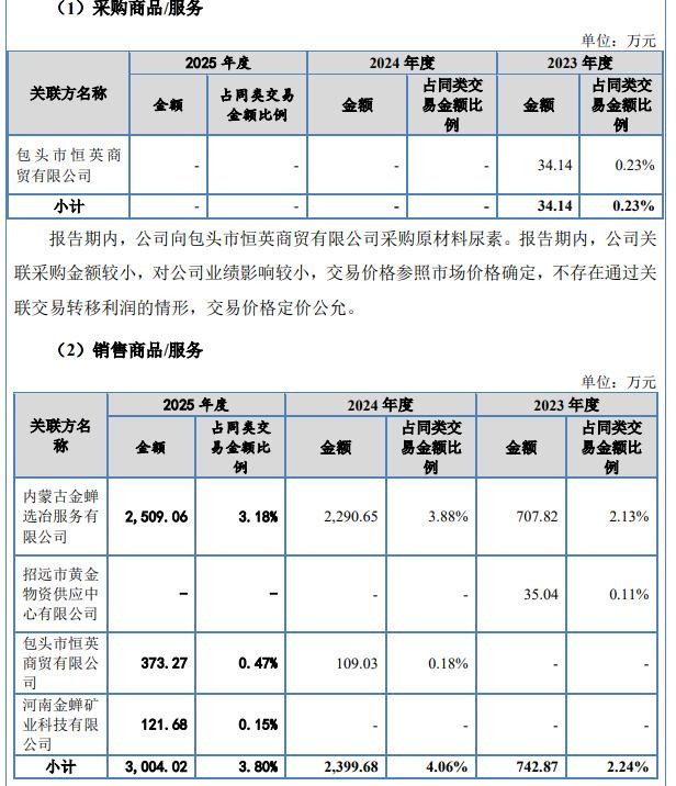 2024年、2025年,公司对包头市恒英商贸有限公司(恒英商贸)的销售额差别为109.03万元、373.27万元,另外皮2023年,公司向恒英商贸采购原材料尿素,采购额为34.14万元。
