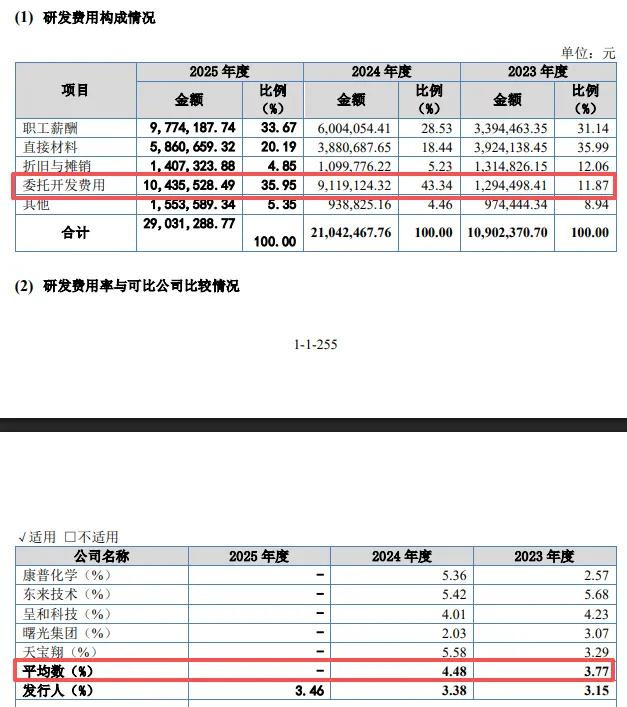 请托开发用度占比最高,2024年研发东说念主员占比低于10%。申报期内,森合高科研发用度稳增,差别为1090.24万元、2104.25万元、2903.13万元,研发用度率差别为3.15%、3.38%、3.48%,对比来看,可比同业2023年、2024年研发用度率均值均提升公司,差别为3.77%、4.48%,进一步来看,2024年5家同业中有4家企业的研发用度率提升公司,差别为康普化学、东来技巧、呈和科技、天宝翔,差别为5.36%、5.42%、4.01%、5.58%,朝阳集团以2.08%逾期于其他同业,阐发公司还需要进一步强化研发参预。