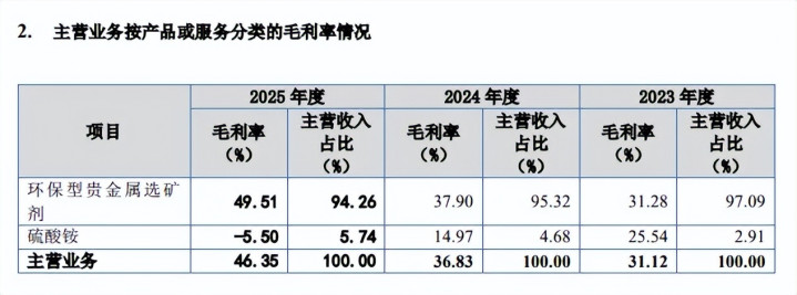 依赖单一家具,硫酸铵毛利率转负。森合高科主营业务收入超94%由环保型贵金属选矿剂孝敬,申报期收入差别为3.32亿元、5.9亿元、7.9亿元,占比差别为97.09%、95.32%、94.26%,存在单一家具依赖。