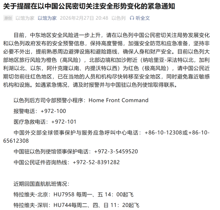 中国驻以色列大使馆发布紧迫见告