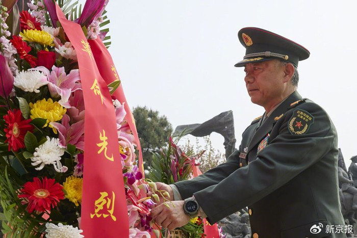 老山前哨参战老兵王晨曦大校整理花篮缎带,向创新先烈致以娴雅敬意与深远顾忌。