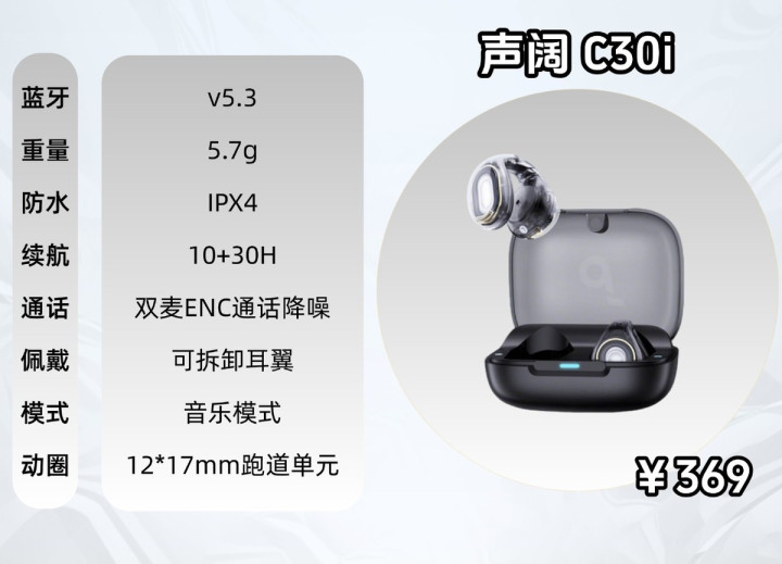 声阔 C30i:音质的360°环绕音真钱投注app官网,听歌可以。有可拆卸耳翼,单耳5.7g,佩带踏实然则舒领域不够,佩带证实一般。