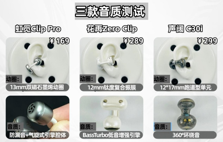 虹觅Clip Pro:具备防漏音款式,灵验保护个东说念主隐痛,单耳微小。气旋式引擎腔体让低音证实可以,举座听感可以。在三百元价位中性价比最高。