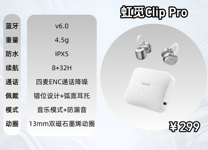 虹觅Clip Pro:这款耳机在佩带、踏实上证实可以,单耳仅4.5克,佩带微小,险些莫得存在感。前高后低的2.5mm错位商量,适配多样耳型,12度弧面耳托紧密贴合耳背分散压力,即使动态场景使用下,耳机拒接易滑落,佩带微小踏实。